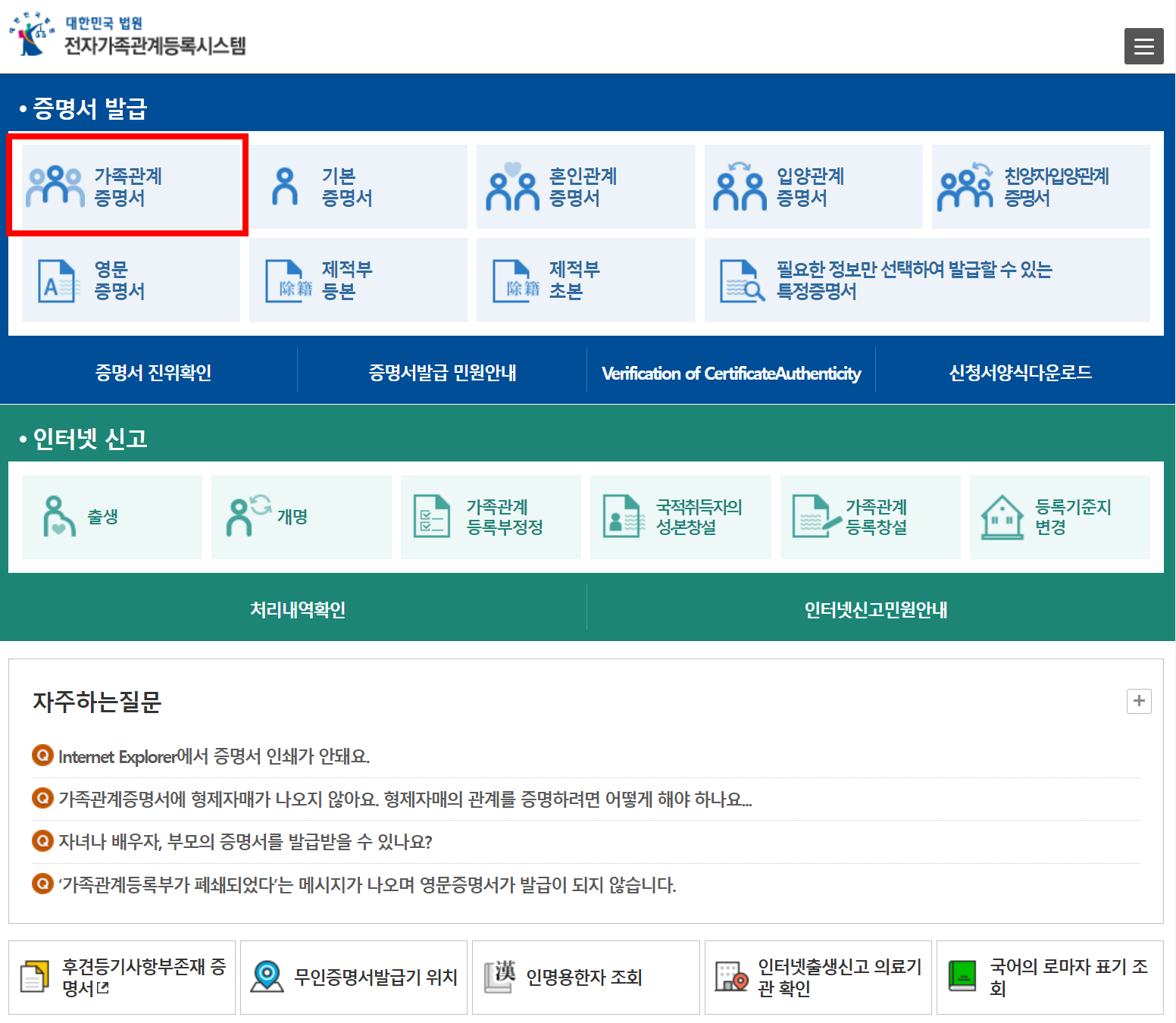 가족관계 증명서 인터넷 발급은 아래 홈페이지에서 신청이 가능합니다.