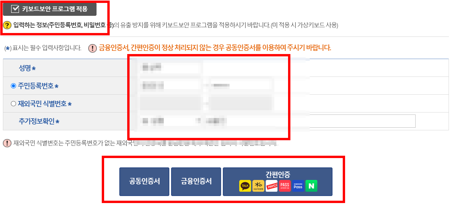 4. 키보드보안 프로그램적용, 개인정보입력 후 인증서로 인증합니다.