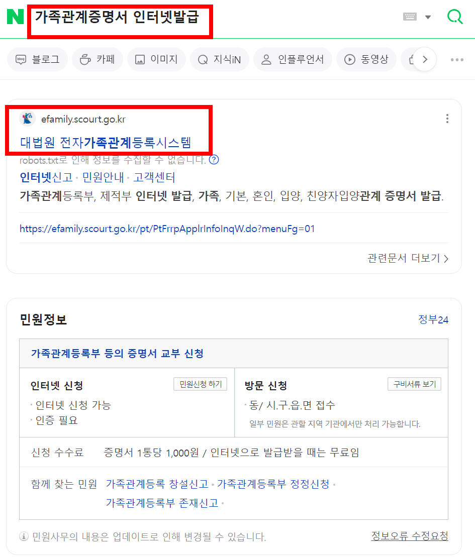 온라인 가족관계증명서 신청서 발급은 정부 24 홈페이지 에서는 되지 않습니다. 이걸 모르고 자연스럽게 정부 24에 들어가서 찾아보는 경우가 있는데 대법원 전자가족관계등록시스템에서 발급이 가능합니다.