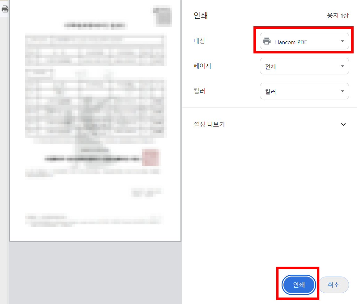 저는 바로 프린트를 할 수 없기에 인쇄 버튼을 눌러 한컴PDF(Hancom PDF)로 변경해줘서 인쇄를 합니다. 이렇게 컴퓨터에 저장 후 프린터가 가능한 곳에가서 프린터를 하시면 됩니다.