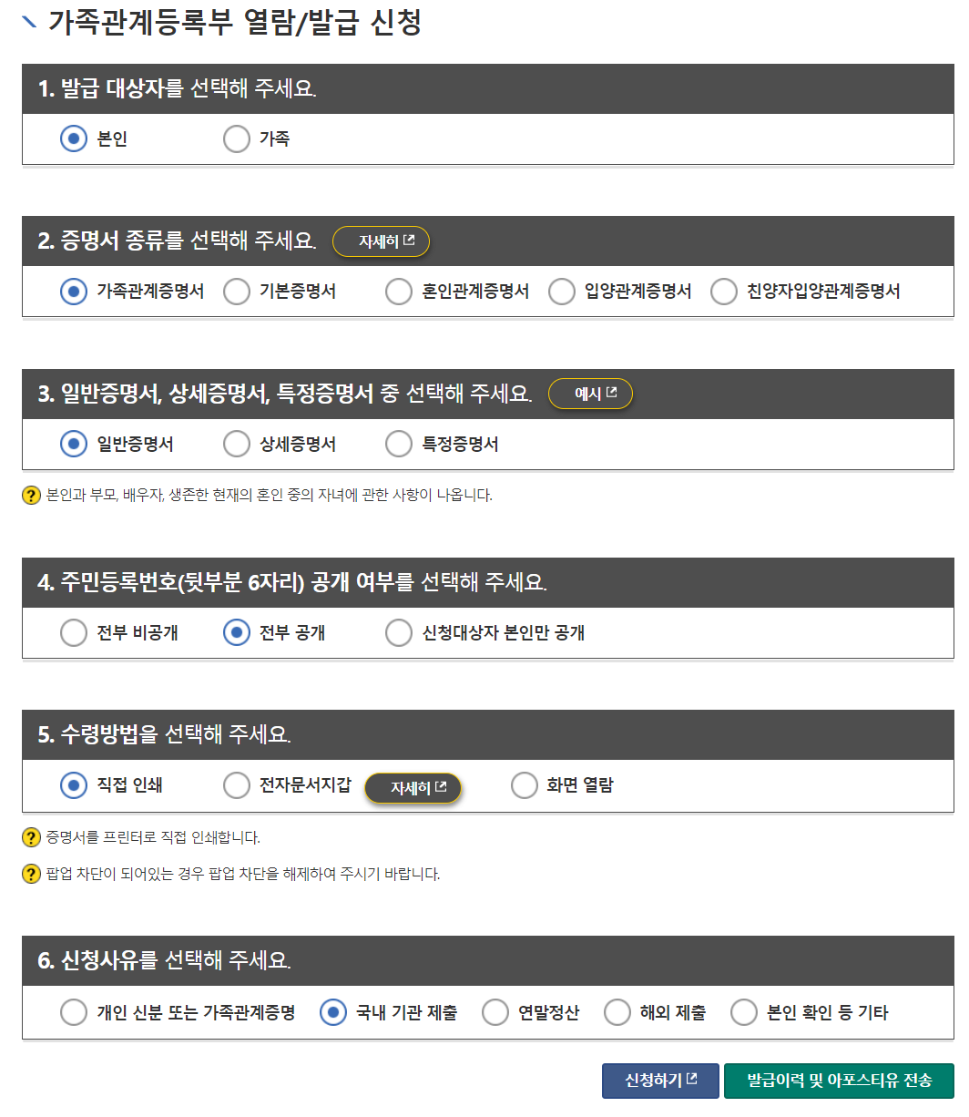 가족관계증명서를 인터넷으로 발급하실때 무엇을 눌러서 발급해야 하는지 헷갈리는 경우가 많은데요. 발급 대상자는 현재 발급하는 본인으로 하는 경우가 많습니다. 가족관계증명서를 선택, 일반증명서 선택, 주민등록번호는 전부 공개로 했습니다. 저는 다자녀 카드를 농협에서 신청 하기위해 방문했더니 주민등록번호를 다 보이게 해서 발급 해 오라고 하셔서 발급하게 되었습니다. 본인이 제출하고자 하는 곳에 물어보고 하시면 됩니다. 직접인쇄, 국내기관 제출을 누른 후 신청하기 버튼을 눌러줍니다.