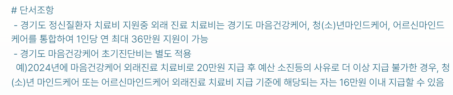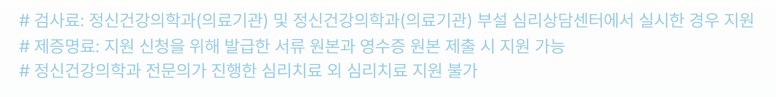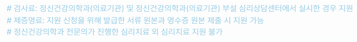 정신건강의학과 외래 치료비 본인일부부담금, 본인부담금 연 36만원 내에서 지원하며 2024년 예산 소진시까지 지원합니다. 진찰료, 약제비, 주사료, 정신요법료, 검사료, 제증명료 등 지원이 되며 입원료는 지원이 불가 합니다.