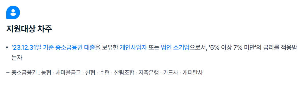 소상공인 이자 환급을 받을 수 있는 지원 대상은 2023년 12월 31일을 기준으로 중소금융권 2금융(수협, 새마을금고, 농협, 신협, 산림조합, 저축은행, 카드사, 캐피탈사) 대출을 보유하고 있는 사업자입니다.