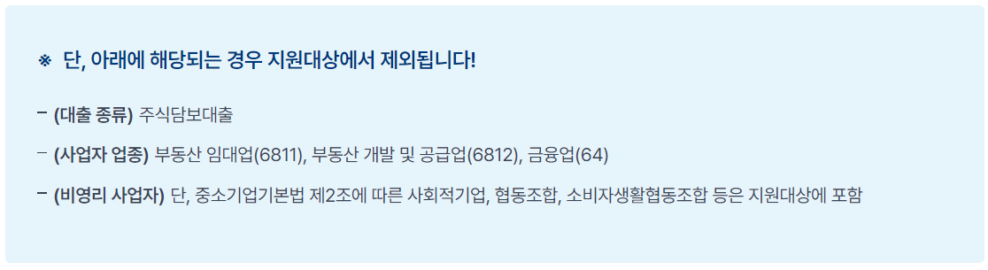 부동산 임대업은 제외 되며 이자를 1년이상 납인한 사실이 확인되면 이자 환급 신청 이후 도래하는 시점의 분기말에 1년 치 환급액을 한번에 지급 해 드립니다. 1인당 최대 150만원을 한번에 받을 수 있습니다.