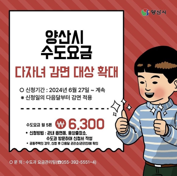 양산시 수도요금 다자녀 감면 대상이 확대 되면서 직접 신청해야 합니다. 신청은 2024년 6월 27일 부터 계속 되어 집니다. 단 신청 후 바로 적용 되는것이 아니고 다음달 부에 적용이 되니 서둘러서 신청하시는게 조금 떠 빠른 혜택을 받으실 수 있습니다.
