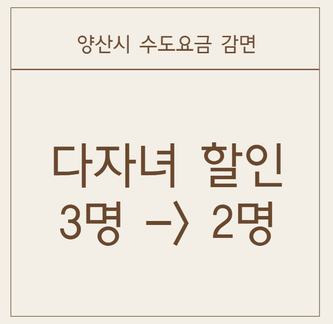 양산시에서도 드디어 수도요금 할인의 다자녀 기준이 3명에서 2명으로 변경되었습니다. 6,300원 할인이 신청한 다음 달 부터 적용 된다고 하니 확인 하시면 바로 신청 하세요.
