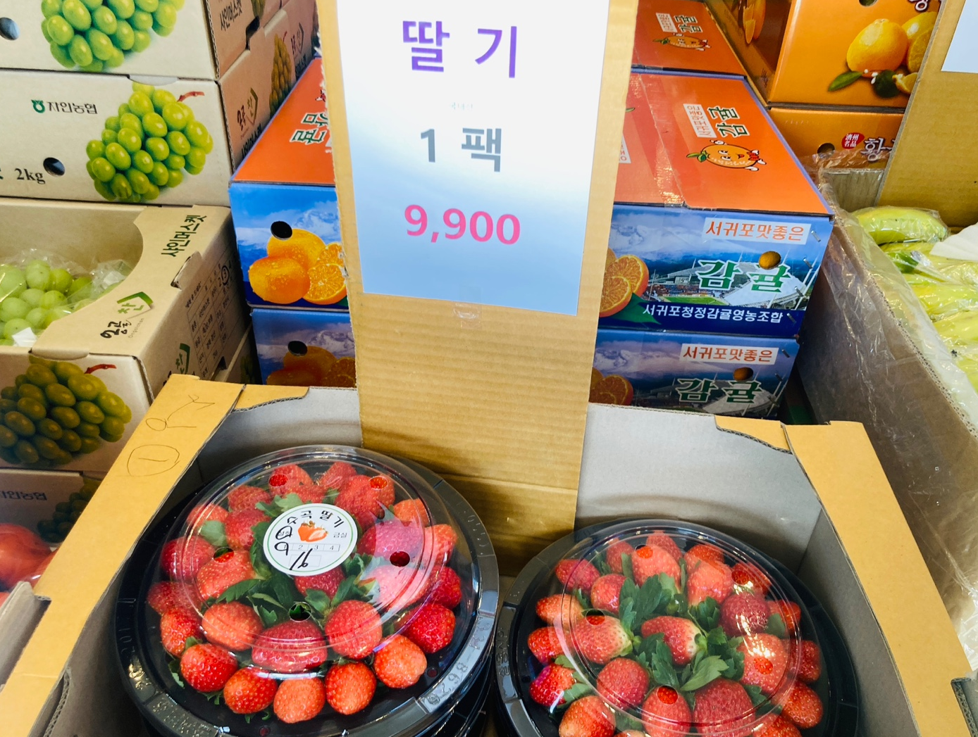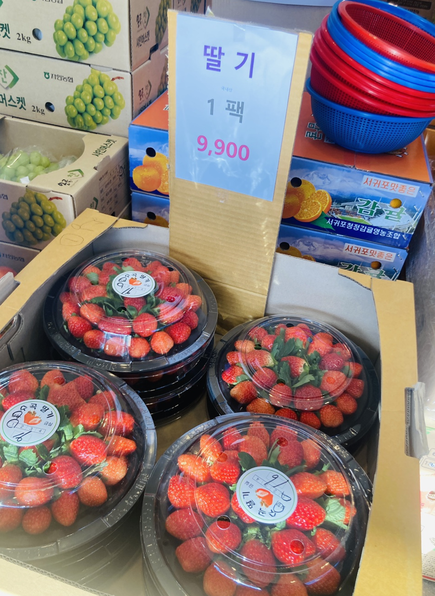 다른 과일들도 싼것도 많았지만 오늘은 올겨울 들어 처음 보는 딸기라서, 그것도 가격도 좋고 하나 맛보여주셨는데 엄청 달더라고요. 아이들과 먹으려고 3팩 사왔어요.