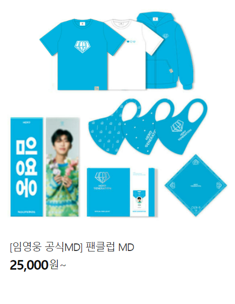 반팔티셔츠, 후드집업, 마스크세트, 슬로건, 영웅시대 키트, 포토카드 앨범, 담요, 볼캡, 스카프 등이 있습니다.