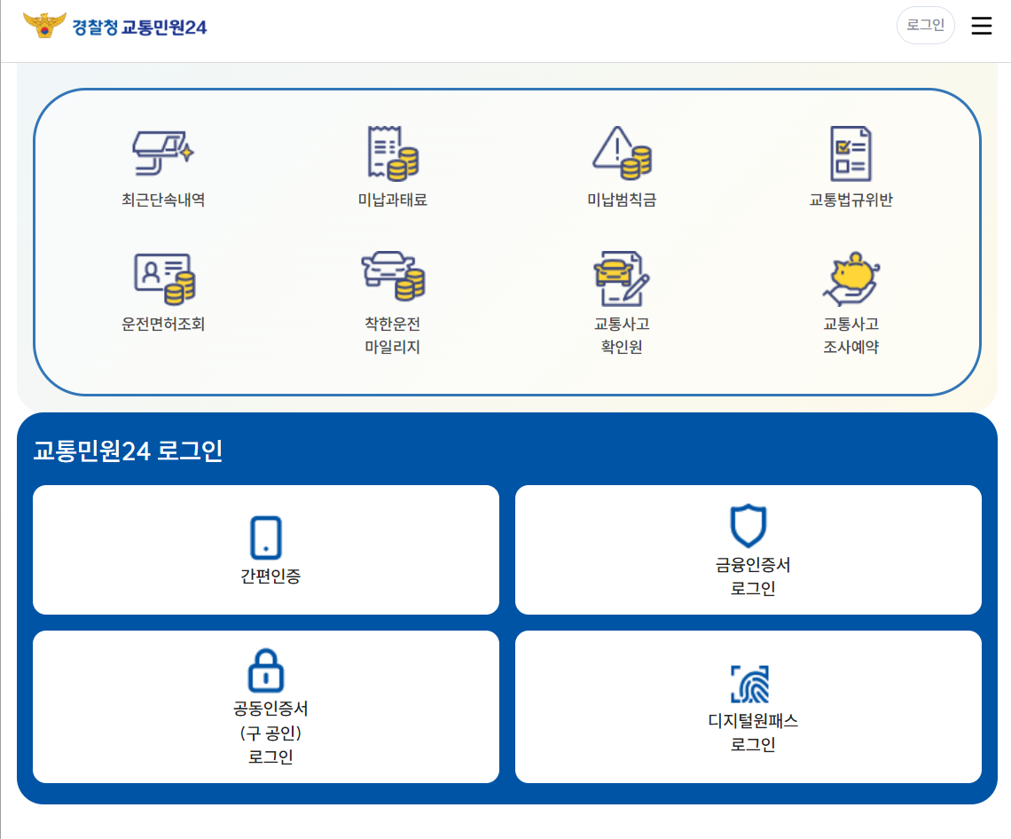 경찰청교통민원 24 이파인 홈페이지로 이동합니다. 메인화면에 가장 많이 확인하는 최근단속내역, 미납과태료, 미납법칙금, 교통법규위반, 운저면허조회, 착한운전마일리지, 교통사고확인원, 교통사고조사예약이 보이는데 아이콘을 누르면 원하는 조회를 바로 하실 수 있습니다.