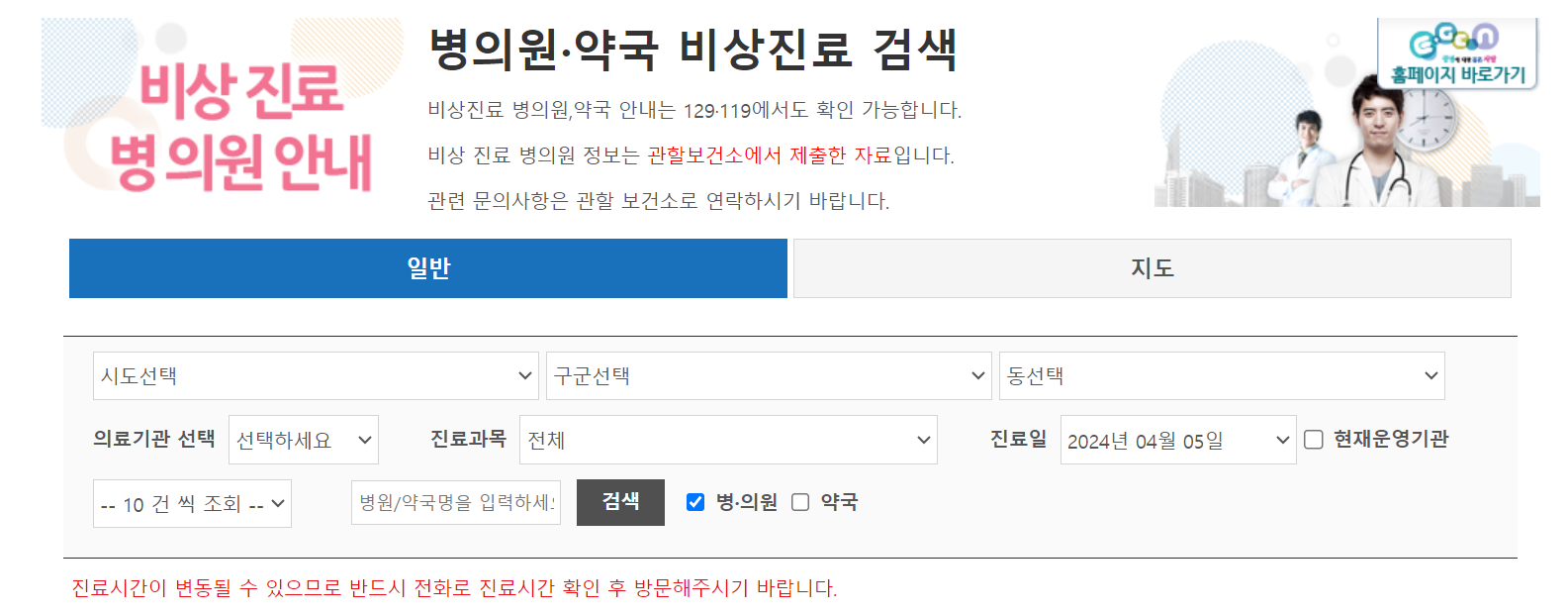 파업기간 비상 진료 병, 의원안내