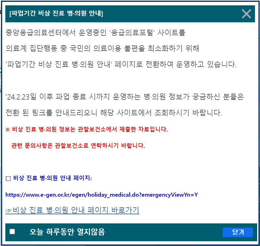 병원 파업으로 인해 24.2.23일 이후부터 파업 종료 시 까지는 비상진료 병의원 안내 페이지에서 확인 하실 수 있습니다. 관할 보건소에서 제출한 자료로 운영이 되고 있으며 문의 사항은 관할 보건소로 연락 하시면 됩니다.